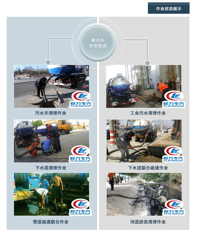 程力專用汽車公司生產的清洗吸污車系列主要功能是為城鄉環衛部門管道疏通,抽吸和運送糞便、淤泥、石子及其它混有較大懸浮雜物的液體。特別適合用于下水道內的淤積物的疏通,抽吸、裝運和排卸,尤其是可吸下水道中的石子、磚塊等較大物體及疏通任何堵塞的下水道。排放有加壓排放和自流排放兩種方式。清洗吸污車具有疏通、抽吸效率高、自吸、自排及直灌等特點,操作快速、簡便。適宜于大、中、小城鎮環衛、市政部門使用。